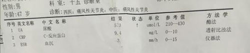 实验室检查结果:尿酸573umol/L;C-反应蛋白9.4mg/L;血沉3mm/h;白细胞10.5;中性细胞数7.27,多种指标均显示不正常。